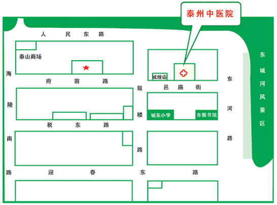 市中醫(yī)院邑廟街院區(qū)-鼓樓大橋-金鷹國際-四人醫(yī)東-海陽東路-城東派出所-啟鼎花園-祥和老年康樂中心-朝暉錦苑-玉堂花園-東河陽光-七里橋-溫泰市場-蘇北商業(yè)廣場-泰州市中醫(yī)院濟川路院區(qū)