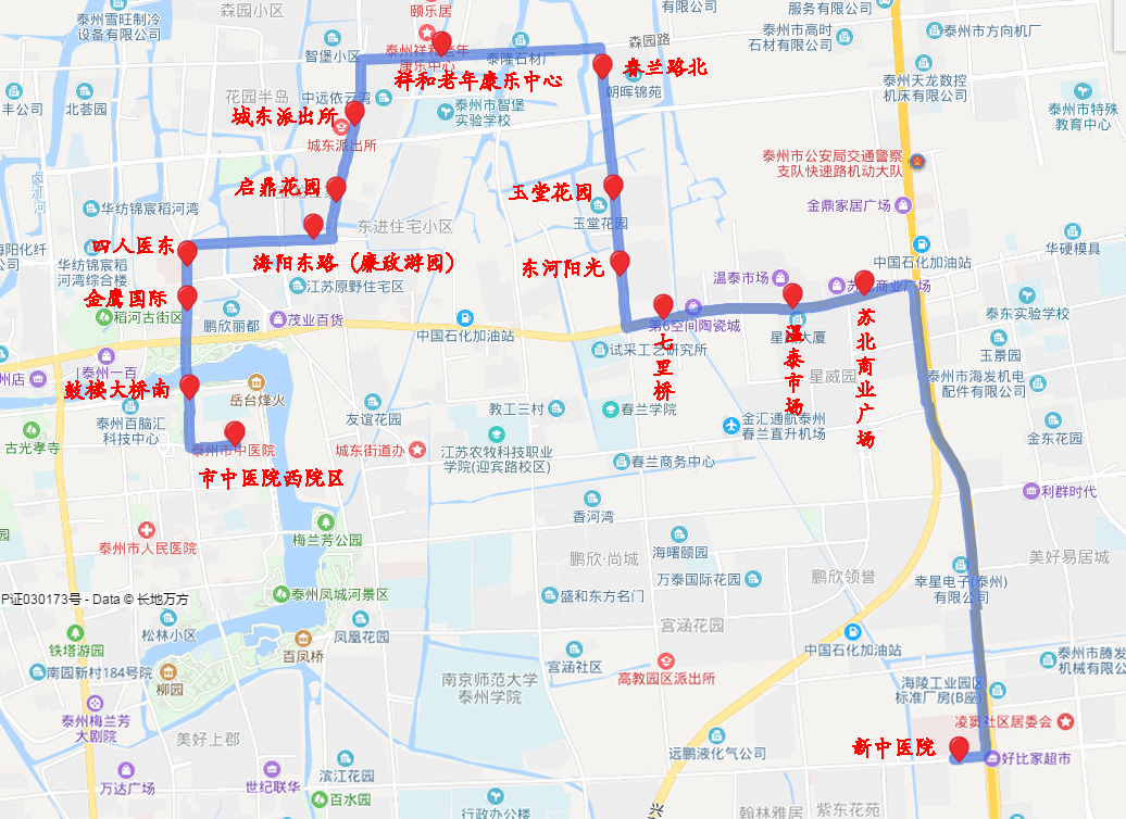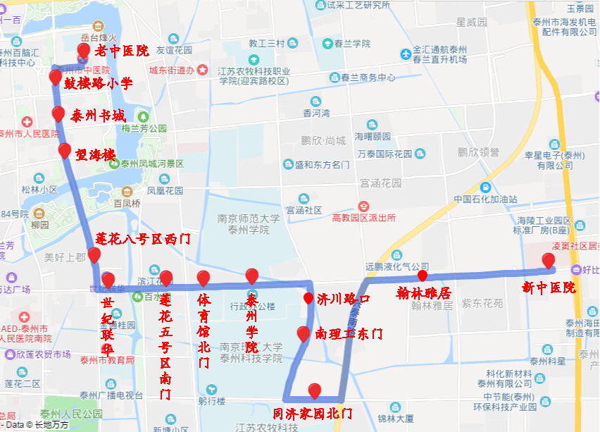 泰州市中醫(yī)院邑廟街院區(qū)-鼓樓路小學-泰州書城-望海樓-蓮花八號區(qū)西門-世紀聯(lián)華-蓮花五號區(qū)南門-體育館北門-泰州學院-濟川路口-南理工東門-同濟家園北門-翰林雅居-泰州市中醫(yī)院濟川路院區(qū)