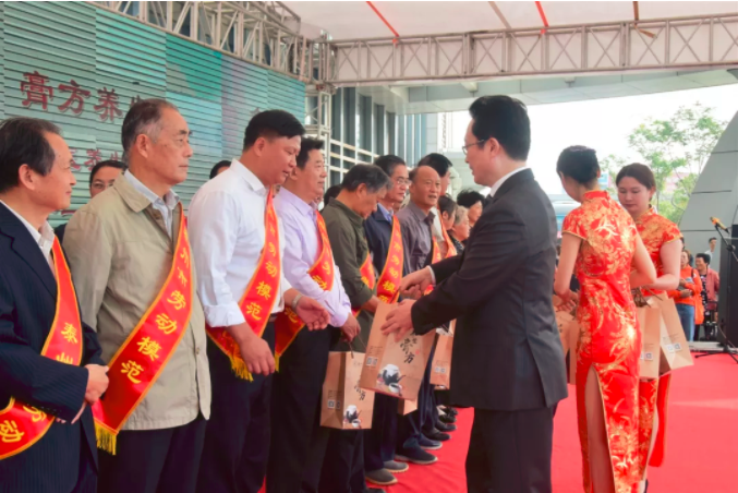 王華為勞模代表頒發(fā)膏方優(yōu)惠券并贈(zèng)送我院特制養(yǎng)生袋泡茶飲