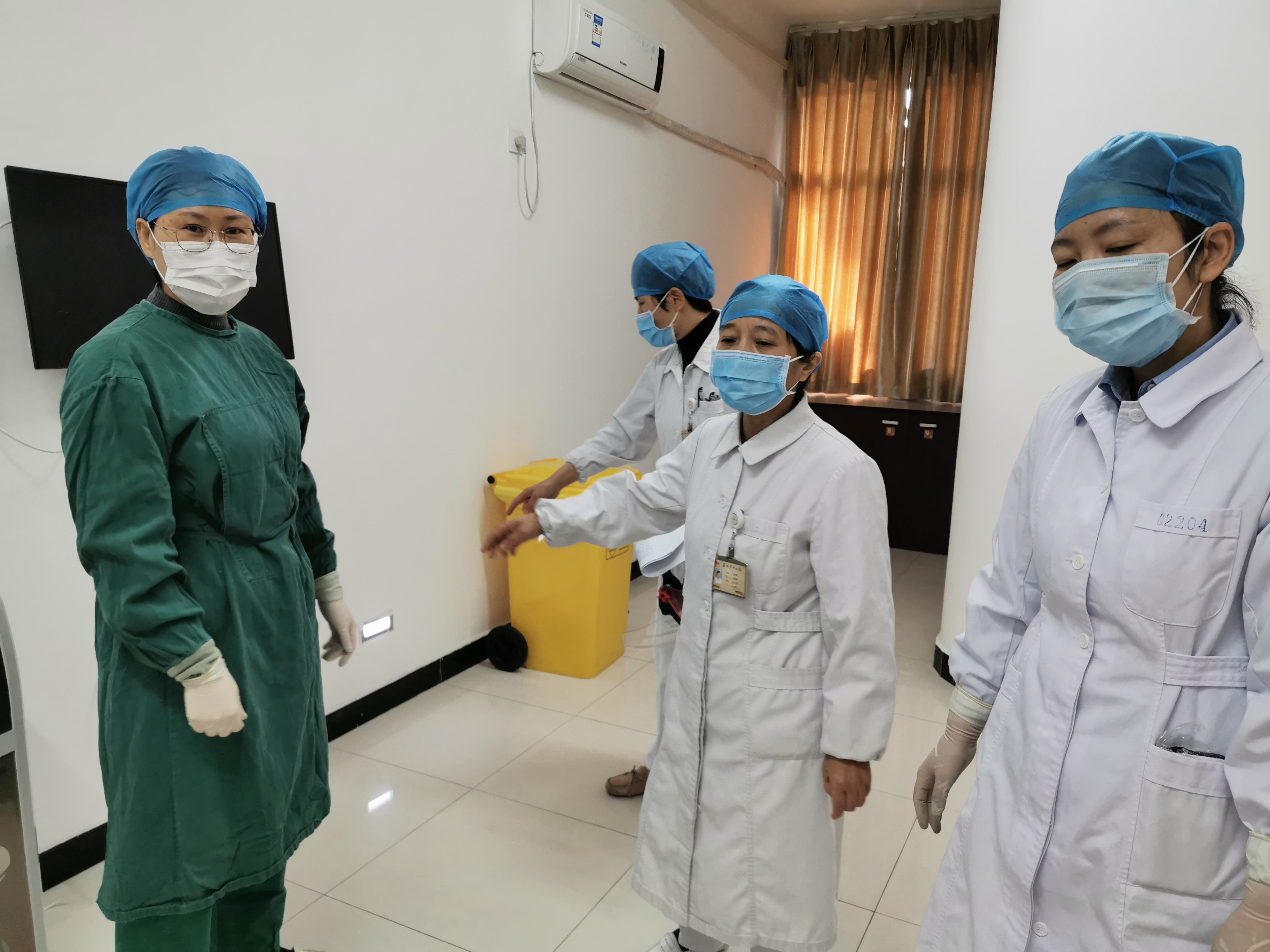 防控工作既責(zé)任重大,又非常細致瑣碎。為了把工作做得盡可能細致無誤,連日來,疾控處感染科朱文琴主任每日帶領(lǐng)團隊人員深入最危險的發(fā)熱門診和隔離觀察室一線,細致查看指導(dǎo)防護工作。從防控制度流程的更新、口罩的佩戴,防護衣的穿脫,護目鏡的佩戴,保潔工作的指導(dǎo),檢驗的操作防護,醫(yī)療廢棄物的處置,她都一一把關(guān),盡力保證把防護工作做到位。每天3-4次的防控操作培訓(xùn)讓她聲音充滿了沙啞的“磁性”,人也顯得有些憔悴,科里的姐妹們看著既心疼又感到敬佩!發(fā)熱門診、隔離留觀室成為她每天必去的地方,人員培訓(xùn)、制度上墻、標牌設(shè)置...。問及她是否害怕,她說,害怕多少是有點的,但作為一名醫(yī)務(wù)人員,疫情當前,堅守自己的崗位,是自己必須做的事。