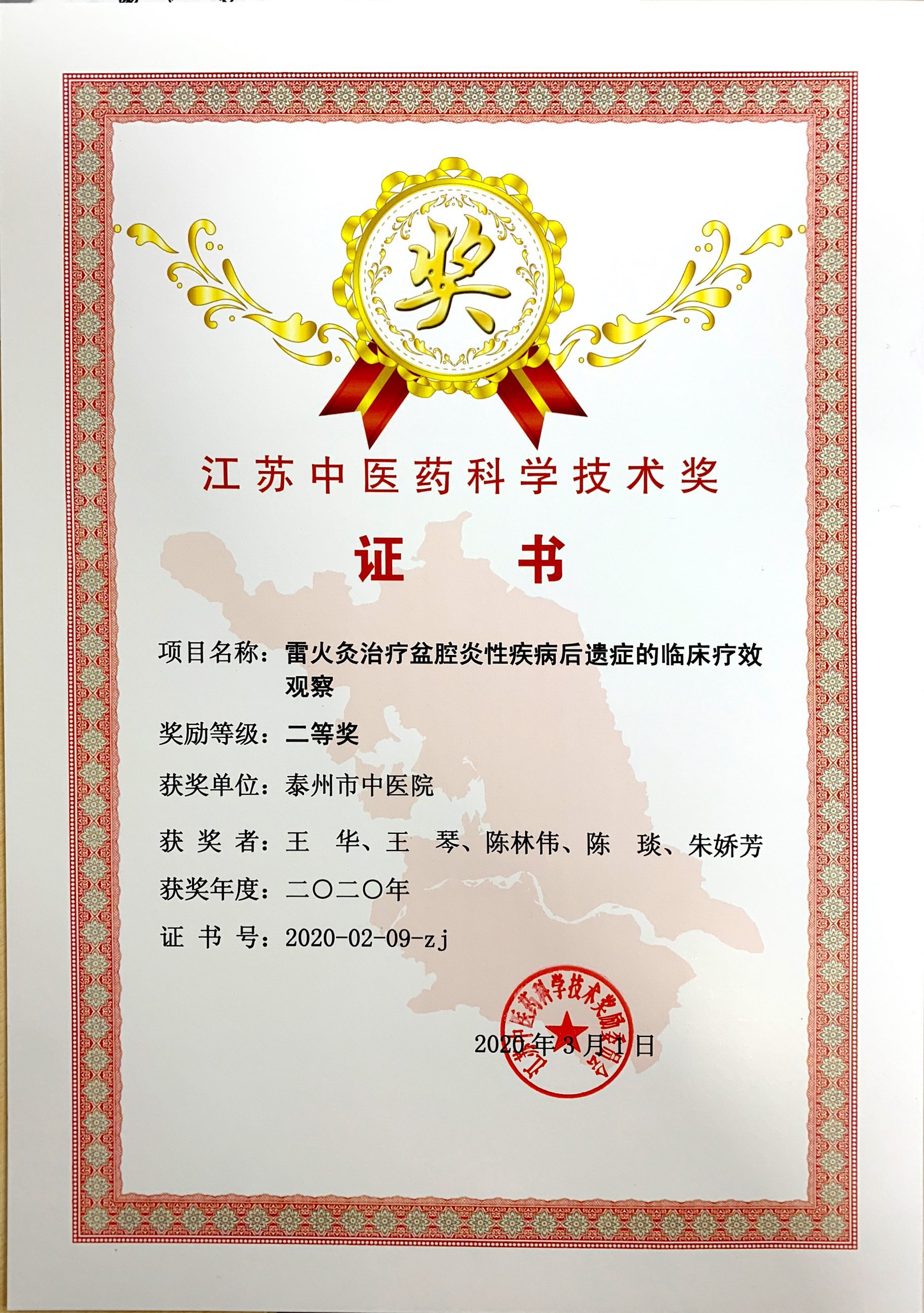 近日,“2020年江蘇省中醫(yī)藥科學技術(shù)獎”評選結(jié)果揭曉,經(jīng)江蘇省各地、各相關(guān)單位遴選推薦,江蘇中醫(yī)藥科學技術(shù)獎獎勵辦公室形式審查,評審委員會按相關(guān)程序組織復(fù)評、答辯、終審,并網(wǎng)上公示,泰州市中醫(yī)院科研項目《雷火灸治療盆腔炎性疾病后遺癥的臨床療效觀察》喜獲2020年江蘇中醫(yī)藥科學技術(shù)獎二等獎。