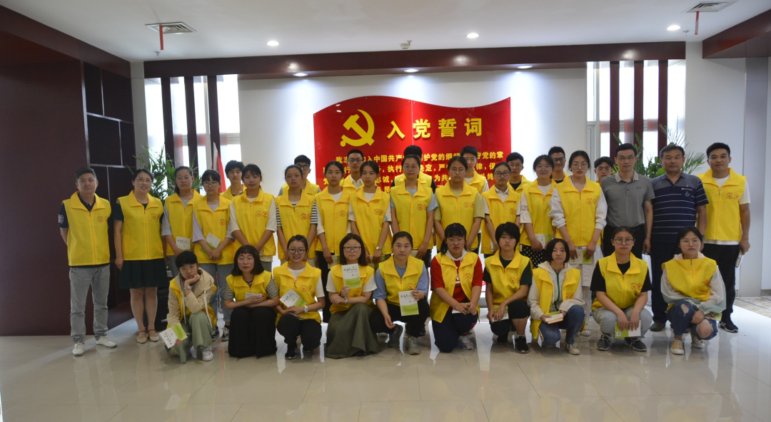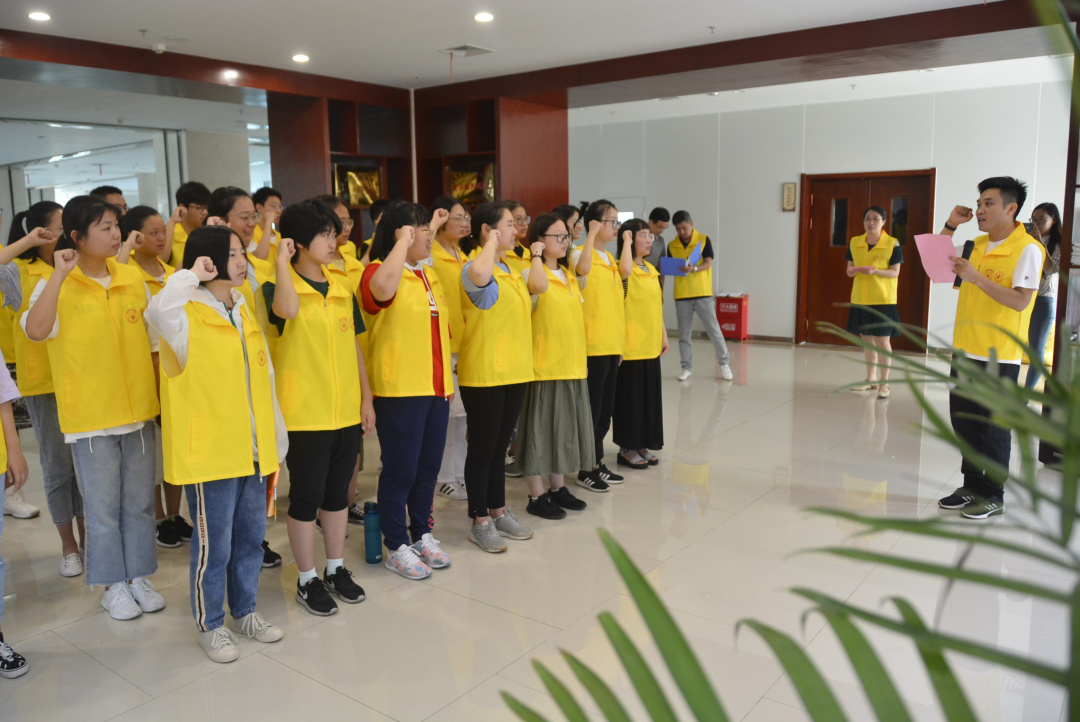 在門診大廳集合后,參加活動(dòng)的青少年志愿者們穿上岐黃先鋒志愿者服務(wù)隊(duì)服裝,來到我院黨員組織生活館的宣誓大廳在團(tuán)委王威書記的帶領(lǐng)下進(jìn)行青年志愿者宣誓儀式。