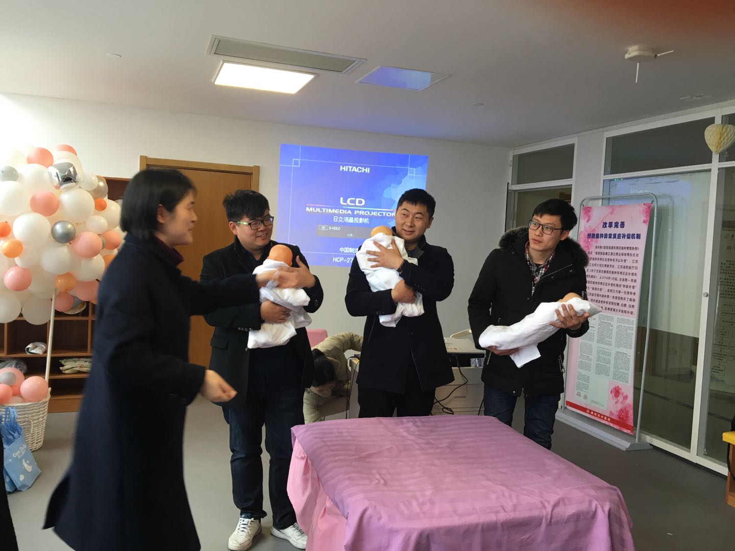 關(guān)愛婦幼,以“愛”為責(zé),最后一個(gè)環(huán)節(jié),由產(chǎn)房吳麗萍護(hù)士長帶動(dòng)大家參與沙龍活動(dòng),特別邀請?jiān)趫龅牧粶?zhǔn)寶爸們現(xiàn)場展示:如何環(huán)抱哭鬧的嬰兒?如何給嬰兒換尿不濕?從寶爸們笨拙的舉止和認(rèn)真的態(tài)度中,大家忍俊不禁的“哄堂大笑”,這不單單激發(fā)了寶爸們的父愛,同時(shí)喚醒了男神們對我們女神寶媽們的敬畏之情,有愛有責(zé)才有家。