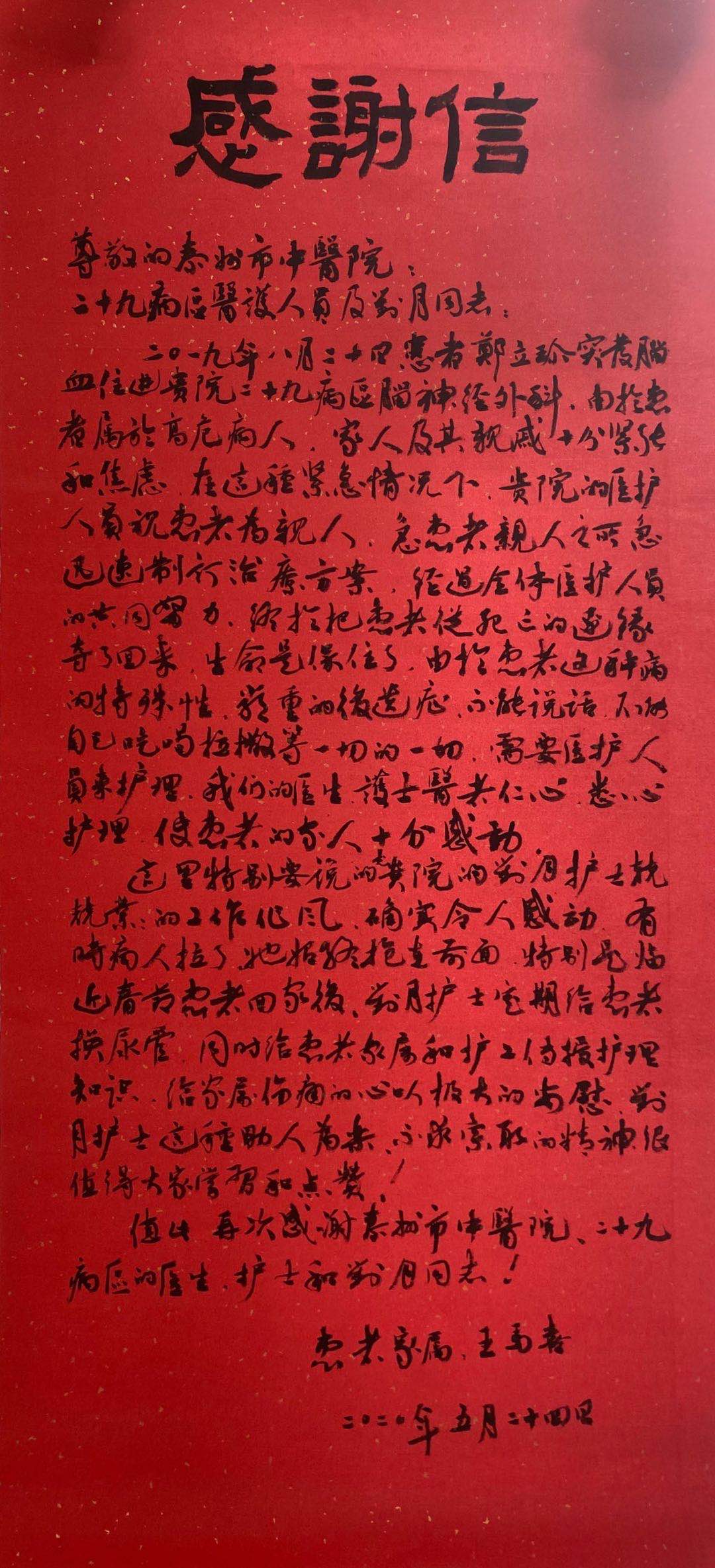 這是腦外科的患者鄭奶奶,讓其家屬代筆,將自己對腦外科醫(yī)護人員,特別是管床護士劉月的滿滿謝意,寫在了1米多長的大紅紙上。