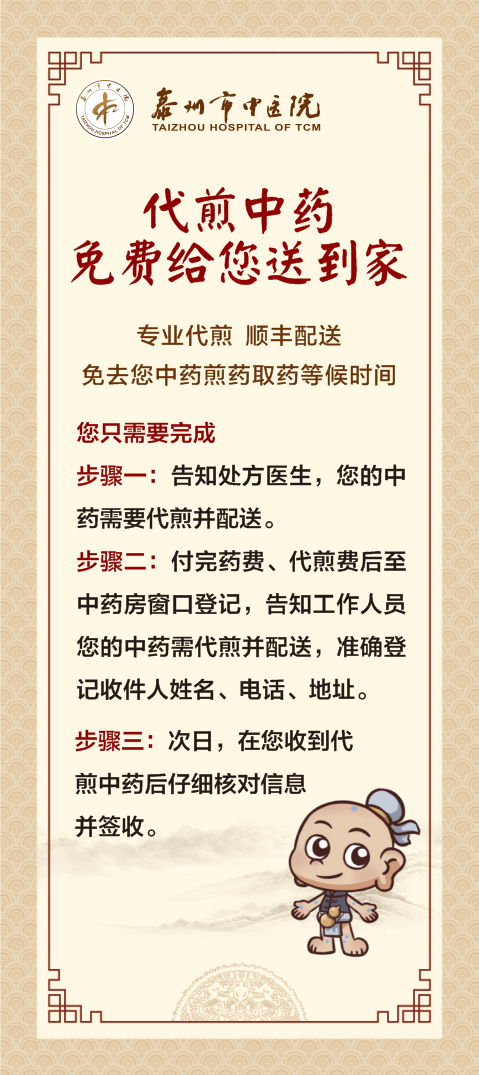 為了更大程度減少患者往返醫(yī)院的次數(shù),提高就醫(yī)效率,實(shí)現(xiàn)門(mén)診就醫(yī)“最多跑一次”。從8月1日起,泰州市中醫(yī)院中藥服務(wù)模式實(shí)施再升級(jí)—“中藥代煎免費(fèi)代寄”,即市民到醫(yī)院看完病,在中藥房拿到醫(yī)生開(kāi)好的中藥后,可按自己的需求,選擇在醫(yī)院的煎藥室煎藥,醫(yī)院將負(fù)責(zé)為市民提供免費(fèi)快遞到家的服務(wù)。