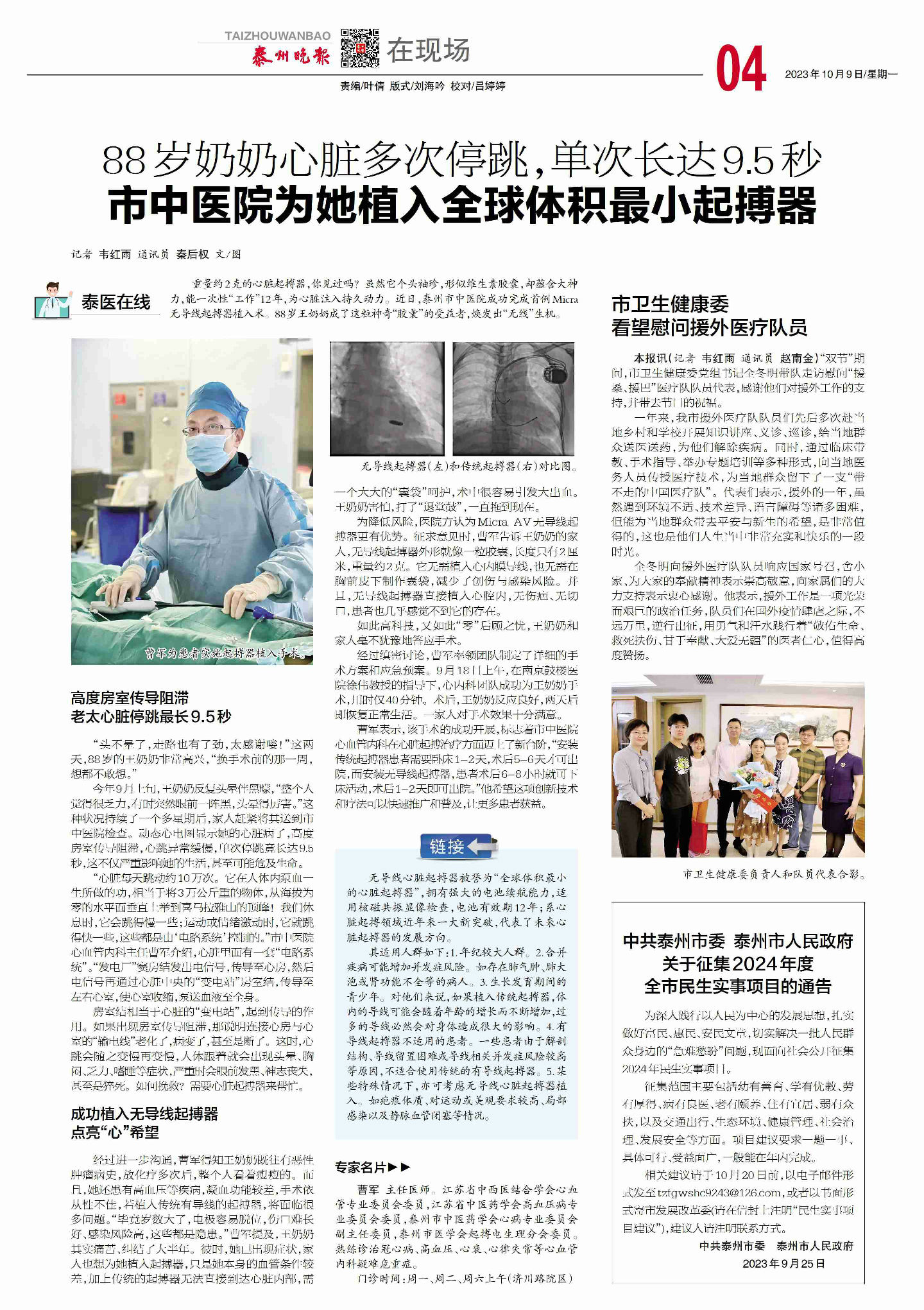 【泰州晚報10月9日】88歲奶奶心臟多次停跳,單次長達9.5秒市中醫(yī)院為她植入全球體積最小起搏器