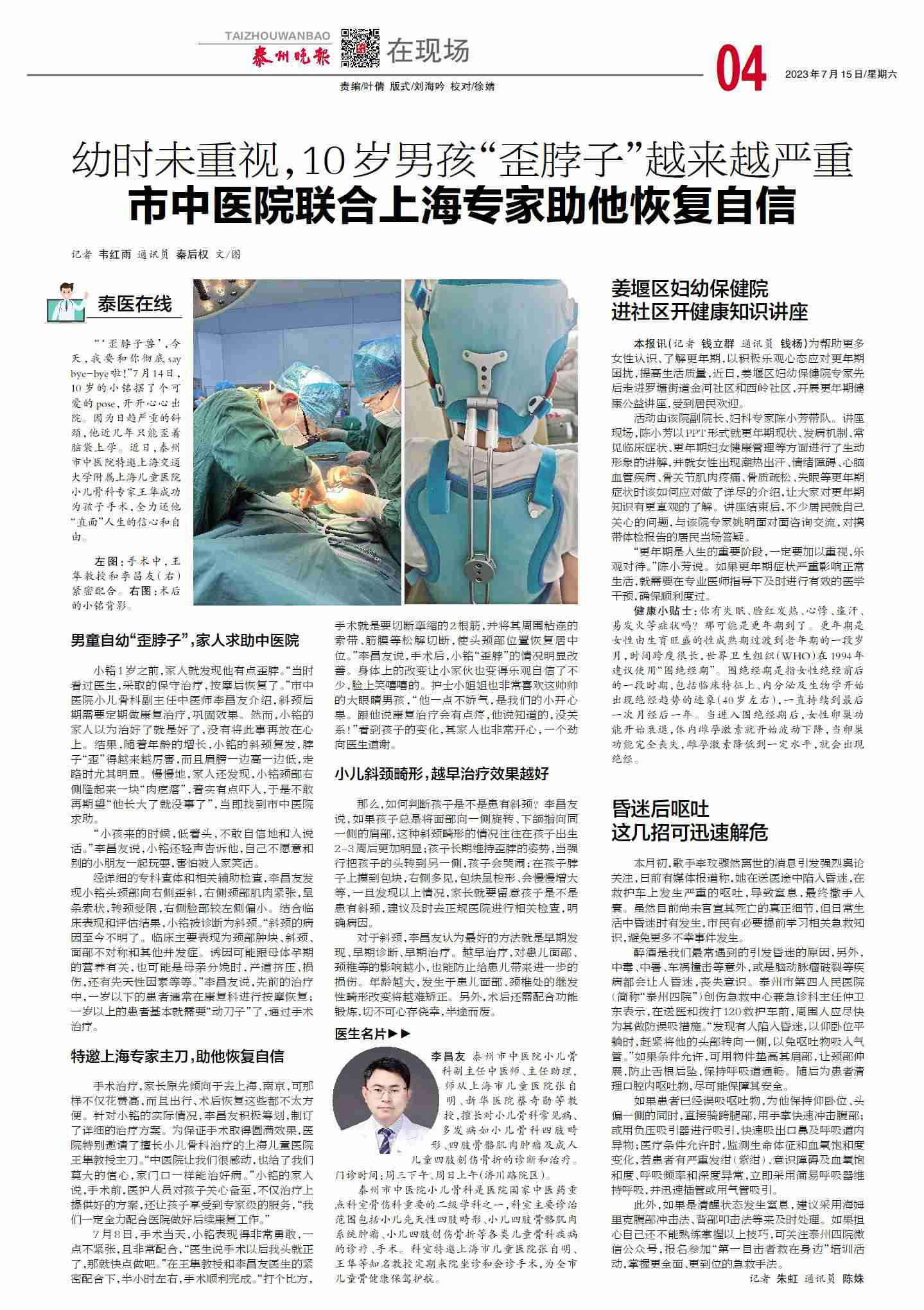 【泰州晚報7月15日】幼時未重視,10歲男孩“歪脖子”越來越嚴重市中醫(yī)院聯(lián)合上海專家助他恢復(fù)自信