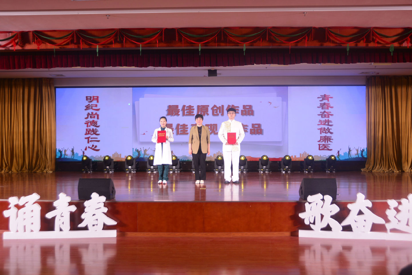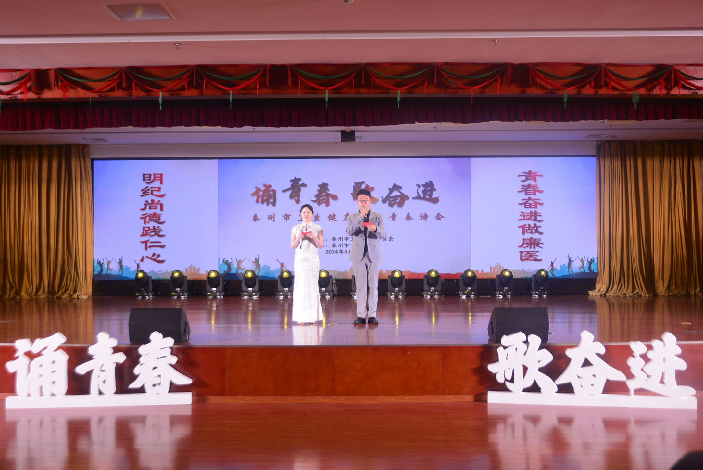明紀(jì)尚德踐仁心,青春奮進(jìn)做廉醫(yī)。為深化拓展主題教育成果,結(jié)合黨紀(jì)學(xué)習(xí)教育,展示衛(wèi)生健康系統(tǒng)青年挺膺擔(dān)當(dāng)、奮發(fā)有為、清廉守紀(jì)的良好形象,進(jìn)一步營造“四敢”爭先的濃厚氛圍,5月23日下午,泰州市衛(wèi)生健康系統(tǒng)“誦青春·歌奮進(jìn)”青春詩會在我院舉辦。11個(gè)醫(yī)療機(jī)構(gòu)單位的參賽團(tuán)隊(duì)登臺競技,唱響衛(wèi)生健康系統(tǒng)的青春贊歌,展現(xiàn)泰州衛(wèi)生健康系統(tǒng)青春風(fēng)采。