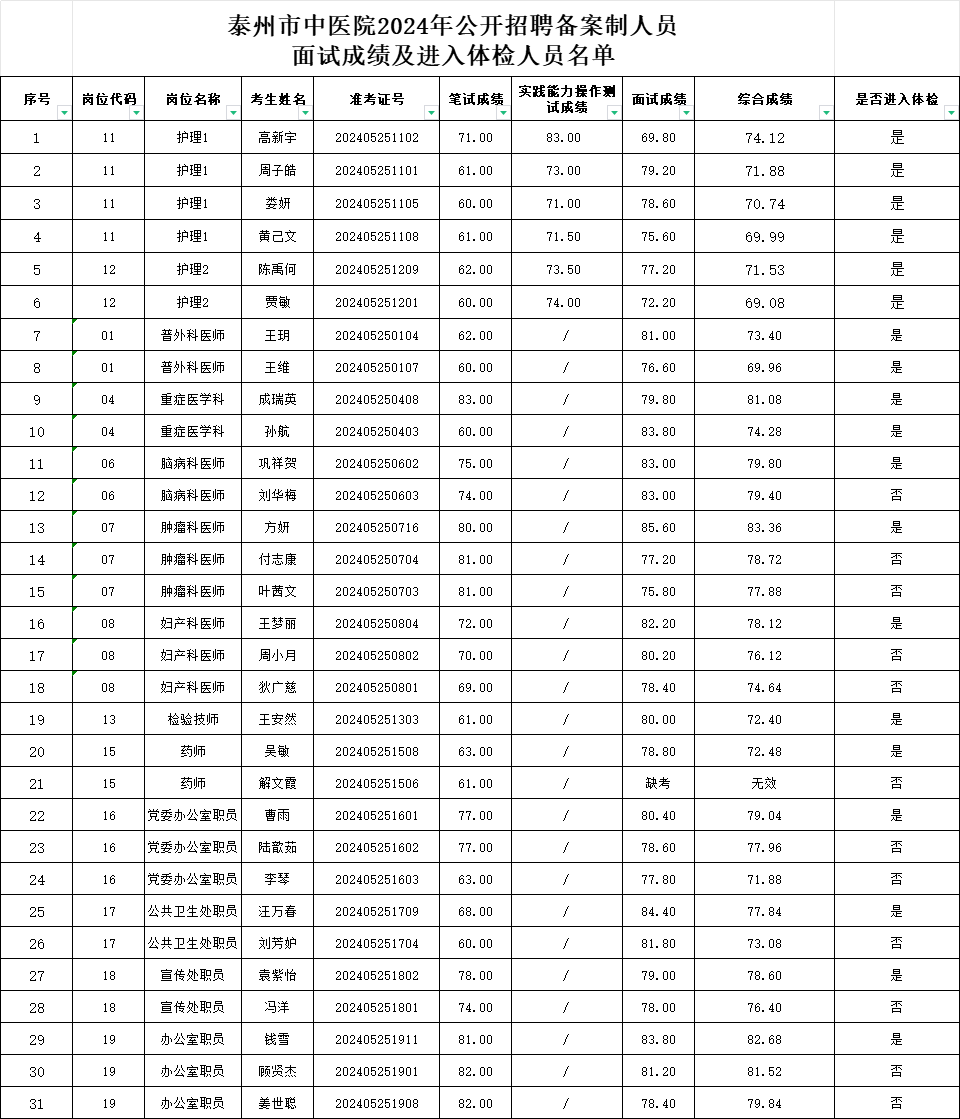 泰州市中醫(yī)院2024年公開招聘備案制人員面試成績及進(jìn)入體檢人員名單