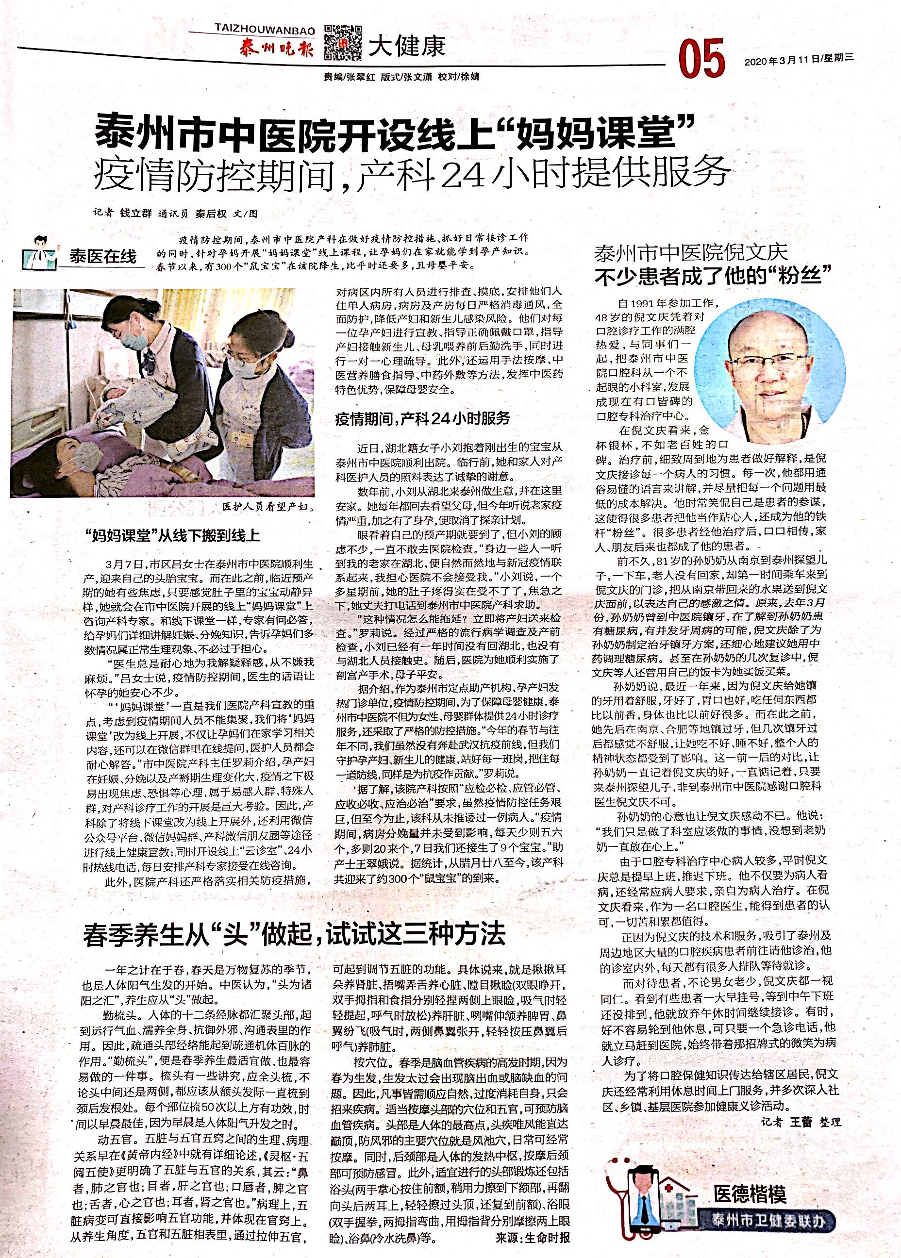 泰州晚報(bào)3.11泰州市中醫(yī)院開設(shè)線上“媽媽課堂”,疫情防控期間,產(chǎn)科24h提供服務(wù)