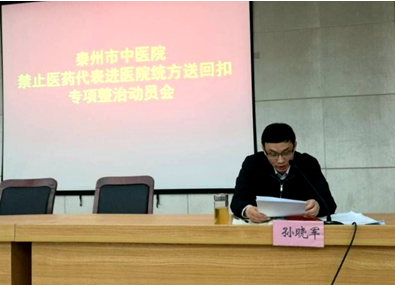 會(huì)上黨委副書記孫曉軍傳達(dá)了市衛(wèi)生計(jì)生委《關(guān)于開展“禁止醫(yī)藥代表進(jìn)醫(yī)院統(tǒng)方送回扣專項(xiàng)整治行動(dòng)”的緊急通知》《中共泰州市紀(jì)委辦公室關(guān)于元旦春節(jié)期間開展“糾四風(fēng)、揚(yáng)清風(fēng)”系列督查行動(dòng)的通知》,并強(qiáng)調(diào)醫(yī)療衛(wèi)生行風(fēng)建設(shè)“九不準(zhǔn)”相關(guān)規(guī)定;會(huì)議要求所有醫(yī)生和相關(guān)人員認(rèn)真觀看2016年12月24日央視播出的專題調(diào)查節(jié)目,醫(yī)生不得與醫(yī)藥企業(yè)和配送商發(fā)生非工作聯(lián)系,“不準(zhǔn)開單提成”,不得提供處方和用藥數(shù)量,不得收受任何形式的藥品回扣,按照上級(jí)紀(jì)委工作部署,院紀(jì)委將堅(jiān)持問(wèn)題導(dǎo)向,重點(diǎn)開展五項(xiàng)督查行動(dòng);強(qiáng)化責(zé)任落實(shí),堅(jiān)決查處頂風(fēng)違紀(jì)行為。