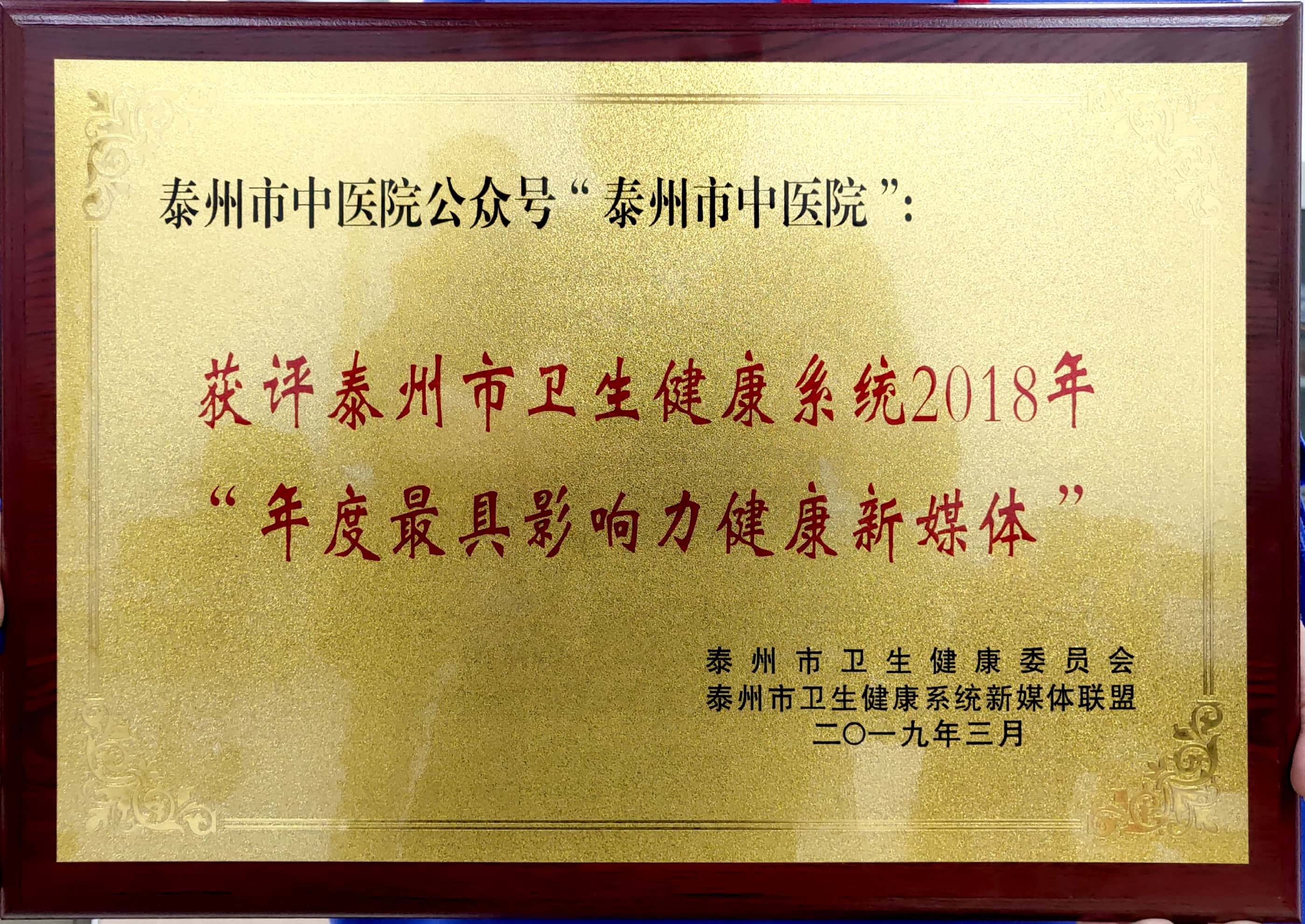 “泰州市中醫(yī)院”公眾號獲泰州市衛(wèi)生健康系統(tǒng)2018“年度最具影響力健康新媒體”。