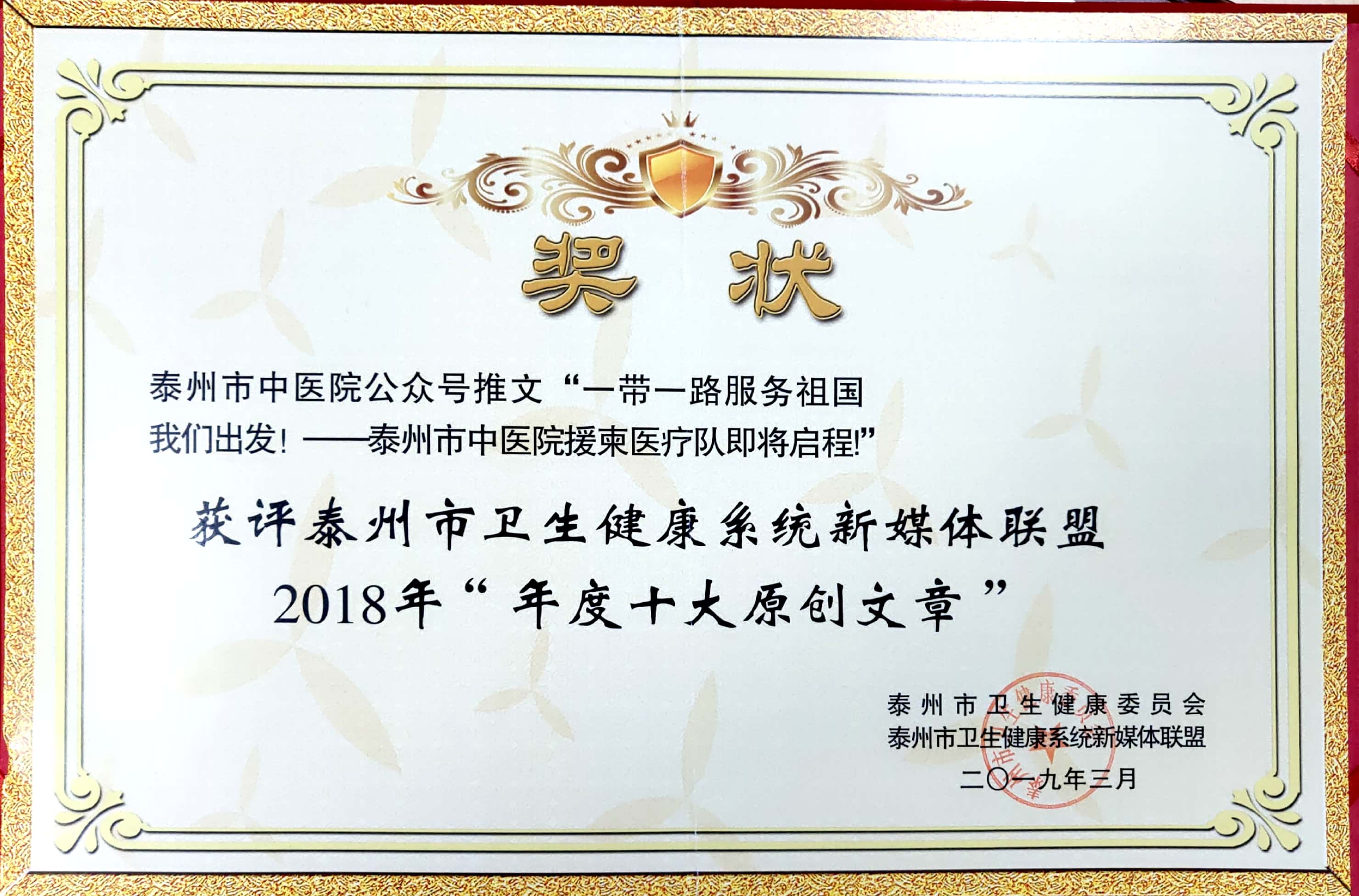 公眾號推文《一帶一路服務(wù)祖國我們出發(fā)!——泰州市中醫(yī)院援柬醫(yī)療隊即將啟程!》獲泰州市衛(wèi)生健康系統(tǒng)新媒體聯(lián)2018年“年度十大原創(chuàng)文章”。